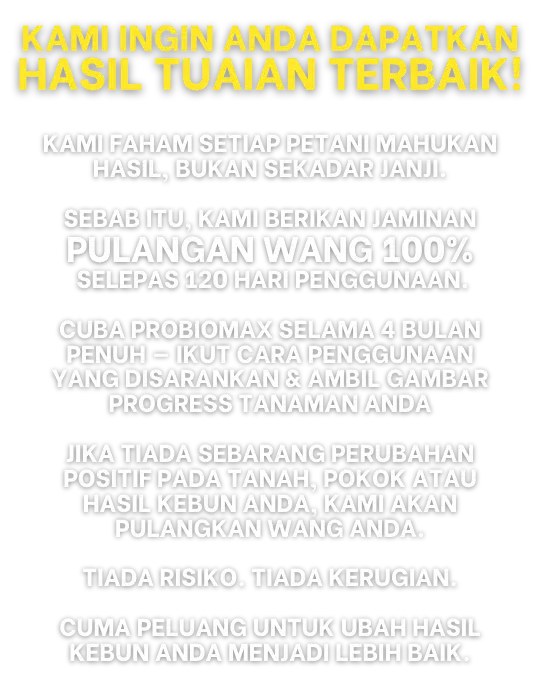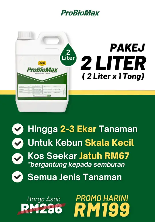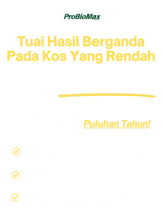 Probiotik dalam Probiomax betulkan struktur tanah, amino asid pula beri nutrien penting untuk tanaman. Hasilnya, tanah lebih subur, pokok lebih sihat, dan buah lebih lebat, berkualiti.