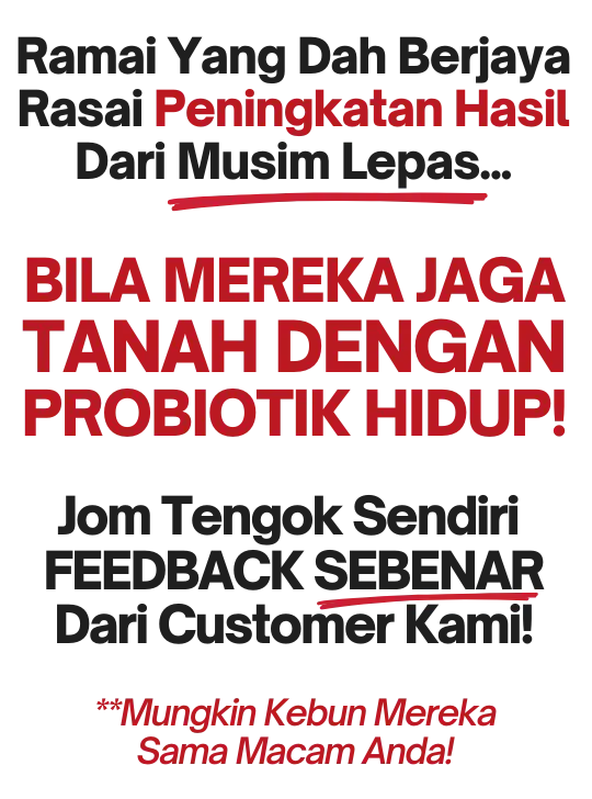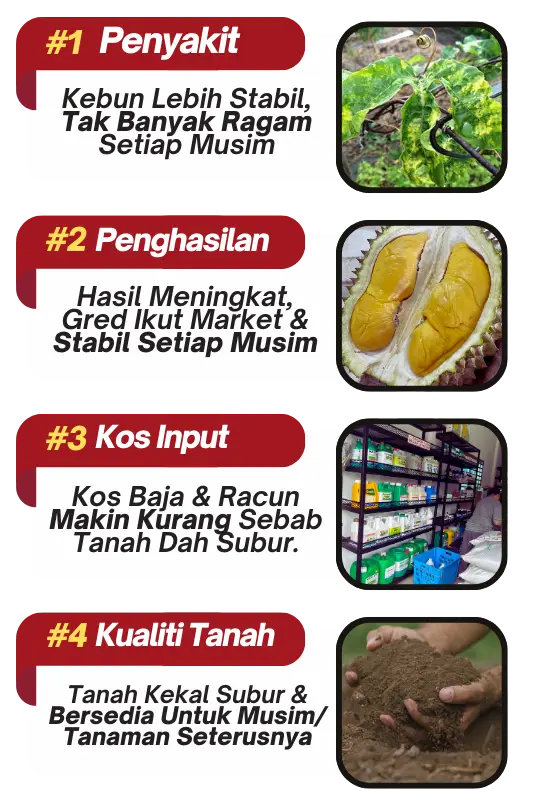 Biasanya dalam 1-2 minggu dah nampak kesan awal: tanah makin elok, pH lebih stabil, dan pokok makin subur. Penyakit tanah pun mula kurang.